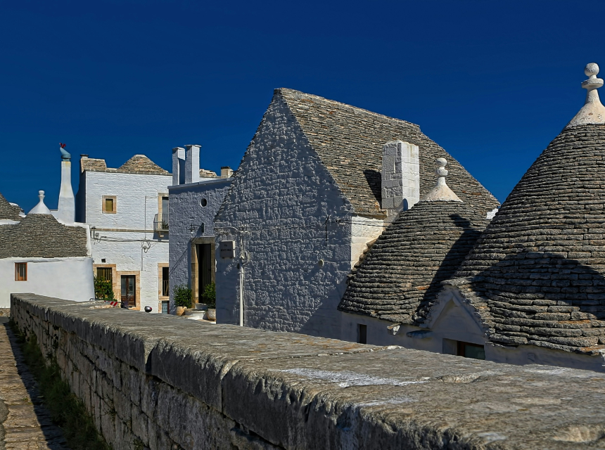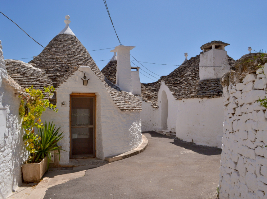De trulli zijn kalkstenen huisjes in de zuidelijke regio Puglia. Deze woningen bestaan al sinds de vroege middeleeuwen. Ze zijn opmerkelijke voorbeelden van cementloze bouw. Dit is een prehistorische bouwtechniek die nog steeds wordt gebruikt in deze regio. De woningen zijn gemaakt van ruwe kalkstenen keien, verzameld uit velden in de buurt. Kenmerkend zijn de stenen daken, die piramidaal, gewelfd of kegelvormig zijn.